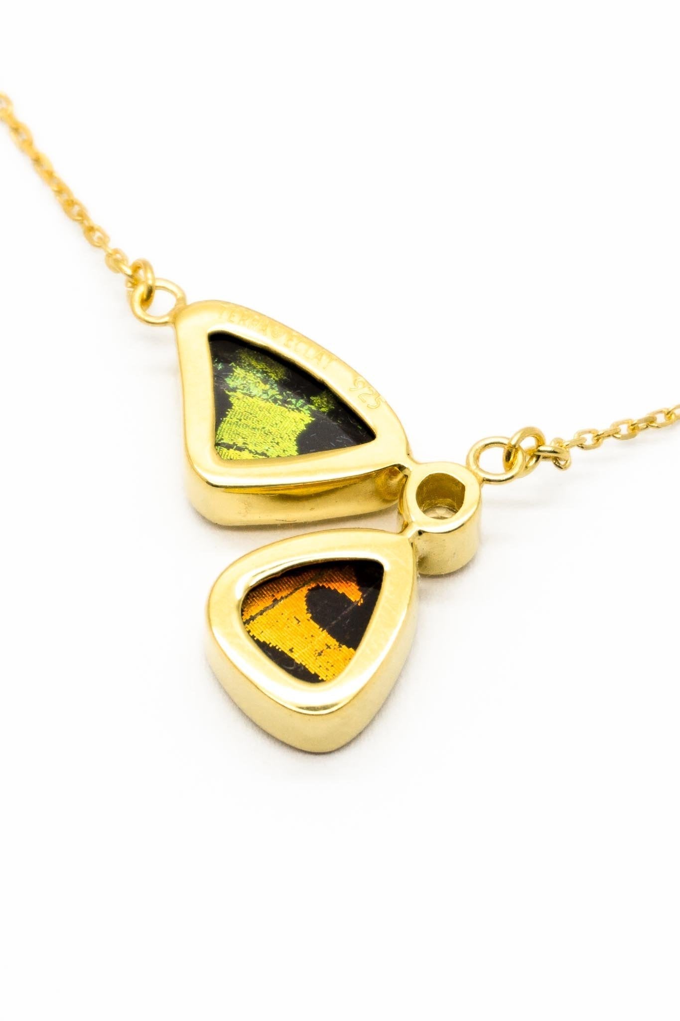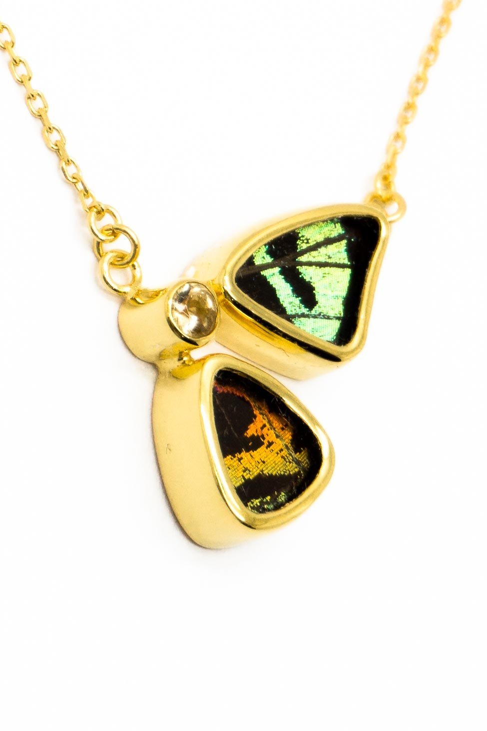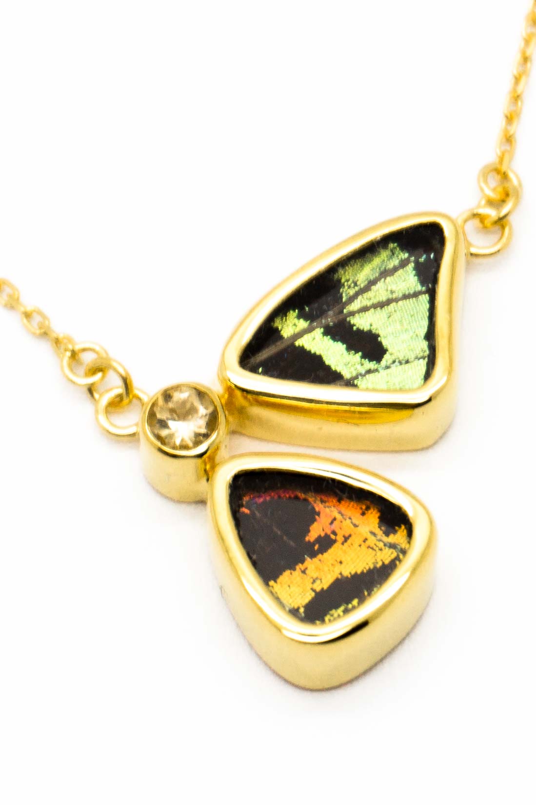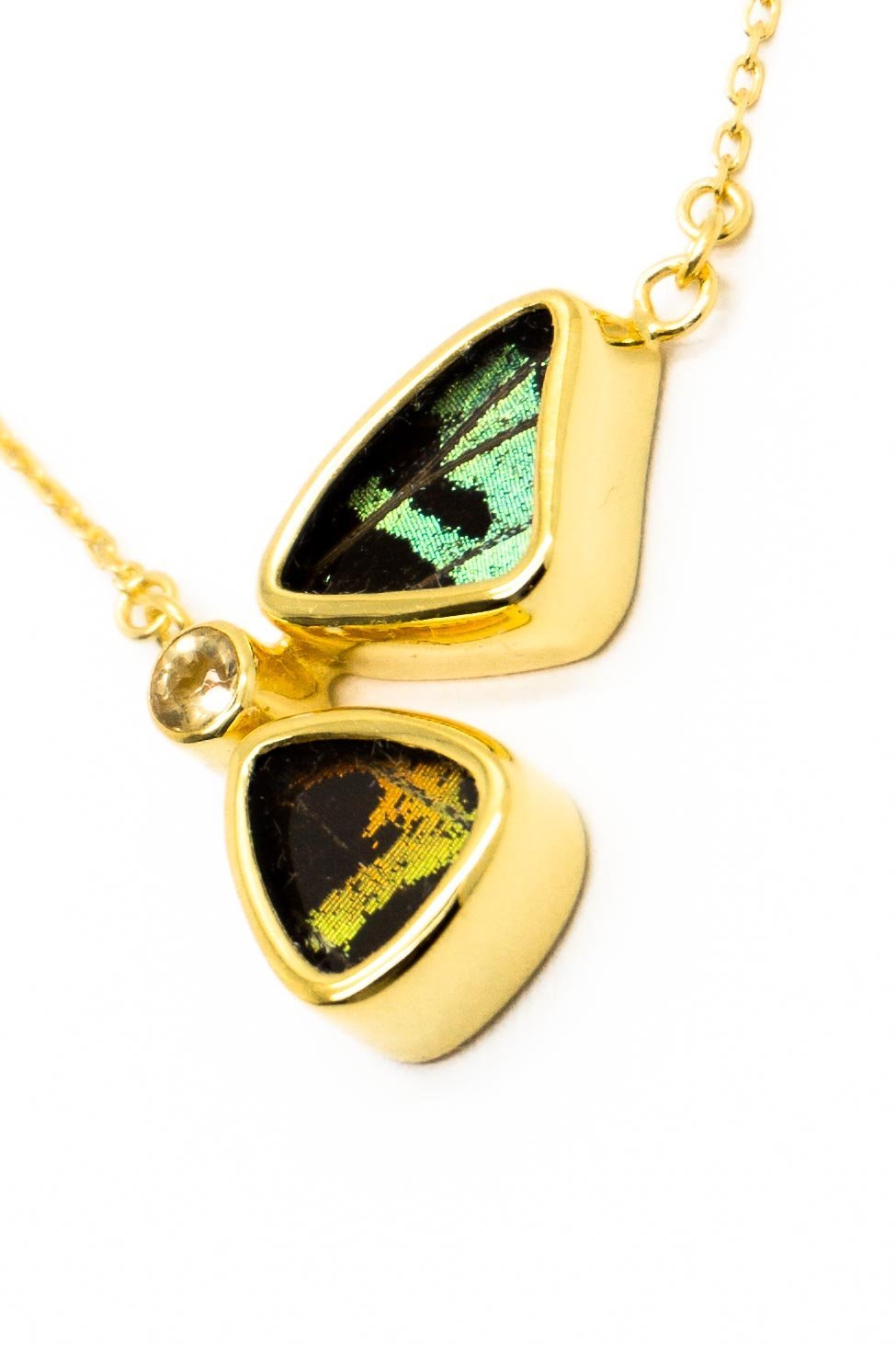2--A-2B-2F-Gold-butterfly-necklace-with-citrine-birthstone-Shimmering-Rainbow-Green-half-Chrysiridia-Madagascariensis