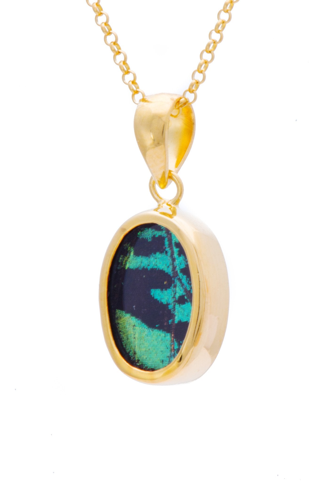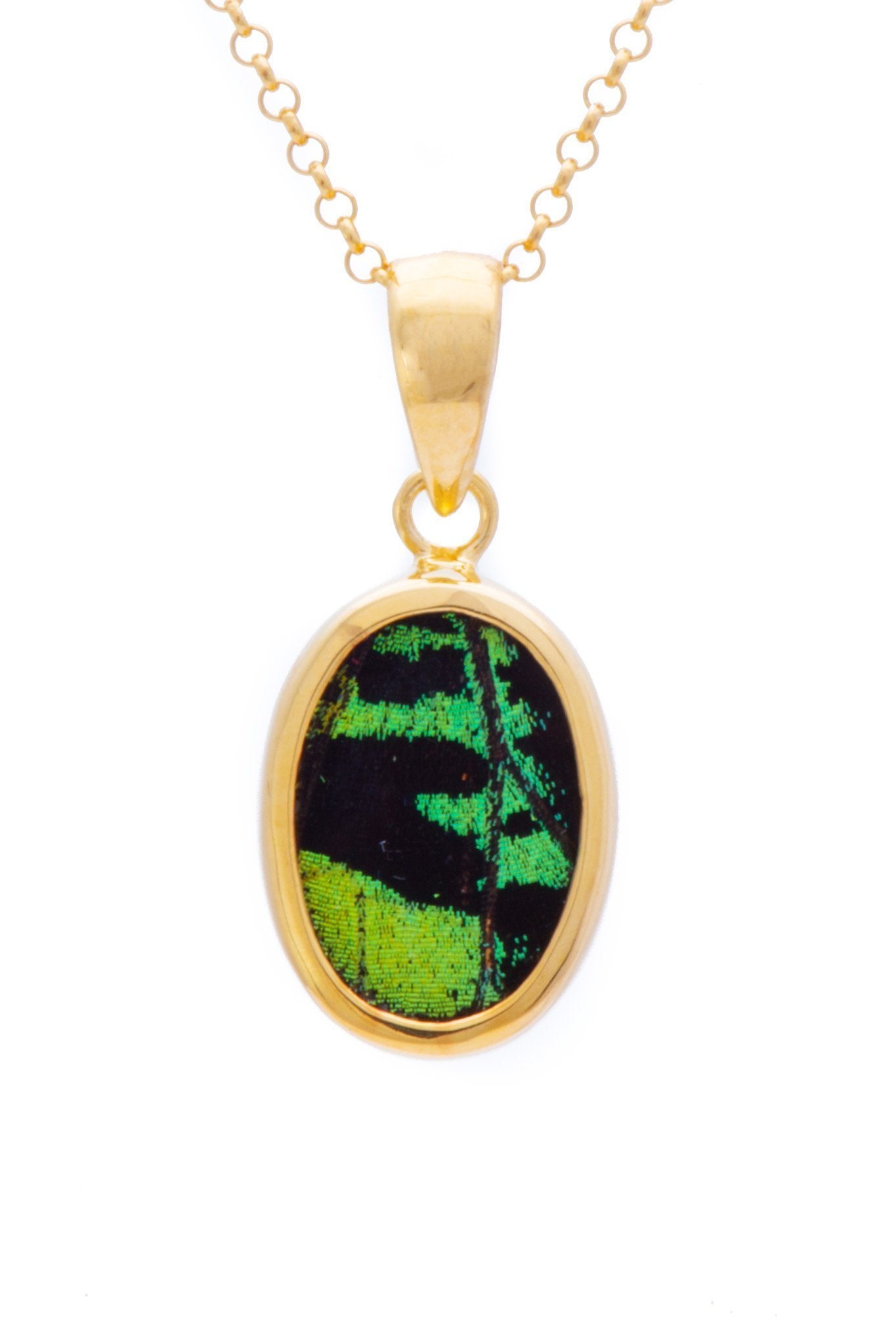 2--A-SB-O1-Gold-butterfly-pendant-Shimmering-Green-Oval-Chrysiridia-Madagascariensis-Top-wing